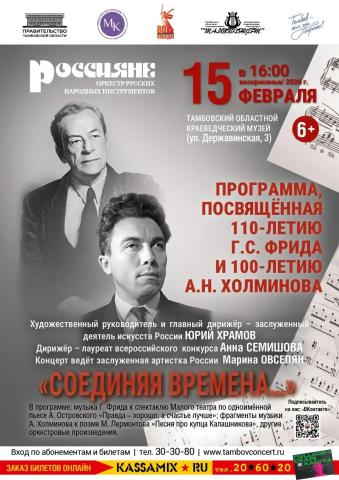 Программа оркестра русских народных инструментов «Россияне» «Соединяя времена» включает в себя малоизвестные или незаслуженно забытые произведения выдающихся отечественных композиторов – юбиляров, внёсших огромный вклад в развитие народно-оркестрового музыкального искусства России.