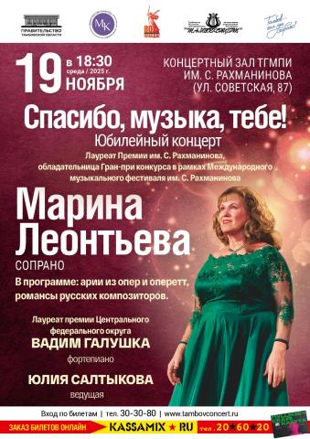 Солистка «Тамбовконцерта», обладательница Гран-При конкурса в рамках международного музыкального фестиваля им. С. Рахманинова, Лауреат Премии им. Р.Рахманинова Марина Леонтьева приглашает зрителей на свой юбилейный концерт.