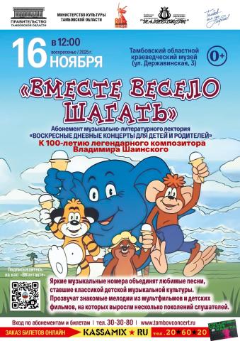 16 ноября 2025 года (воскресенье) в 12.00 часов на сцене Тамбовского областного краеведческого музея (ул. Державинская, 3) состоится детский концерт Музыкально - Литературного Лектория «Вместе весело шагать» (к 100-летию В.Шаинского)