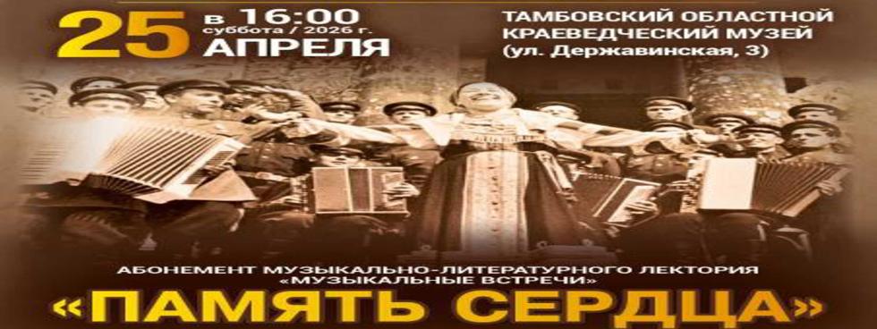25 апреля 2026 года (суббота) в 16 часов на сцене Тамбовского областного краеведческого музея (ул. Державинская, 3) состоится концерт Музыкально - Литературного Лектория «Память сердца»