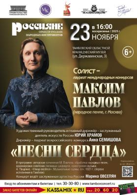 Очередная программа абонемента «Вечерний» оркестра русских народных инструментов «Россияне» – это новая встреча с давно полюбившимся тамбовским слушателям замечательным московским певцом, композитором и поэтом Максимом Павловым (народное пение). Уроженец белорусской глубинки, он, будучи уже известным и востребовательным столичным солистом, всю жизнь поёт о Родине – малой, изначальной и новой, огромной и беззаветно любимой. В его репертуаре – лучшие образцы белорусского и русского народного творчества, советская песенная классика и всякий раз – премьеры прекрасных авторских песен. Таким образом, программа задумана как музыкальное приношение Союзному государству России и Белоруссии. В оркестровом блоке несомненный интерес должна вызвать тамбовская премьера одного из первых значительных произведений академического жанра для русского народного оркестра – Музыкальные сцены Андрея Пащенко «Улица весёлая» (1927 г.). Это колоритные жанрово-бытовые зарисовки, основанные на популярных интонациях городского фольклора первых лет советской эпохи.