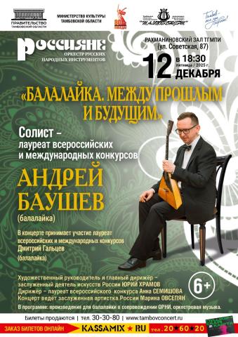 «Балалайка. Между прошлым и будущим» – новая концертная программа оркестра русских народных инструментов «Россияне», в которой соединятся русские народные мелодии, популярная музыка и ритмы сегодняшнего дня, традиции и современность. В исполнении солиста оркестра, лауреата всероссийских и международных конкурсов Андрея Баушева впервые в Тамбове прозвучат композиции «Балалайка XXI века» В. Макаровой, «Lady In Folk» Д. Калинина, в которых фольклорные темы получают неожиданную музыкальную трактовку. Энергичные «Ягодная фантазия» В. Мищенкова и «Хоровод» Е. Желинского дополнят представления о виртуозных и колористических возможностях современной балалайки. Опорными точками программы станут яркие обработки народных мелодий и оригинальные сочинения В. Андреева, А. Шалова, А. Цыганкова, Е. Тростянского и других авторов, ставшие классикой народно-оркестрового искусства.